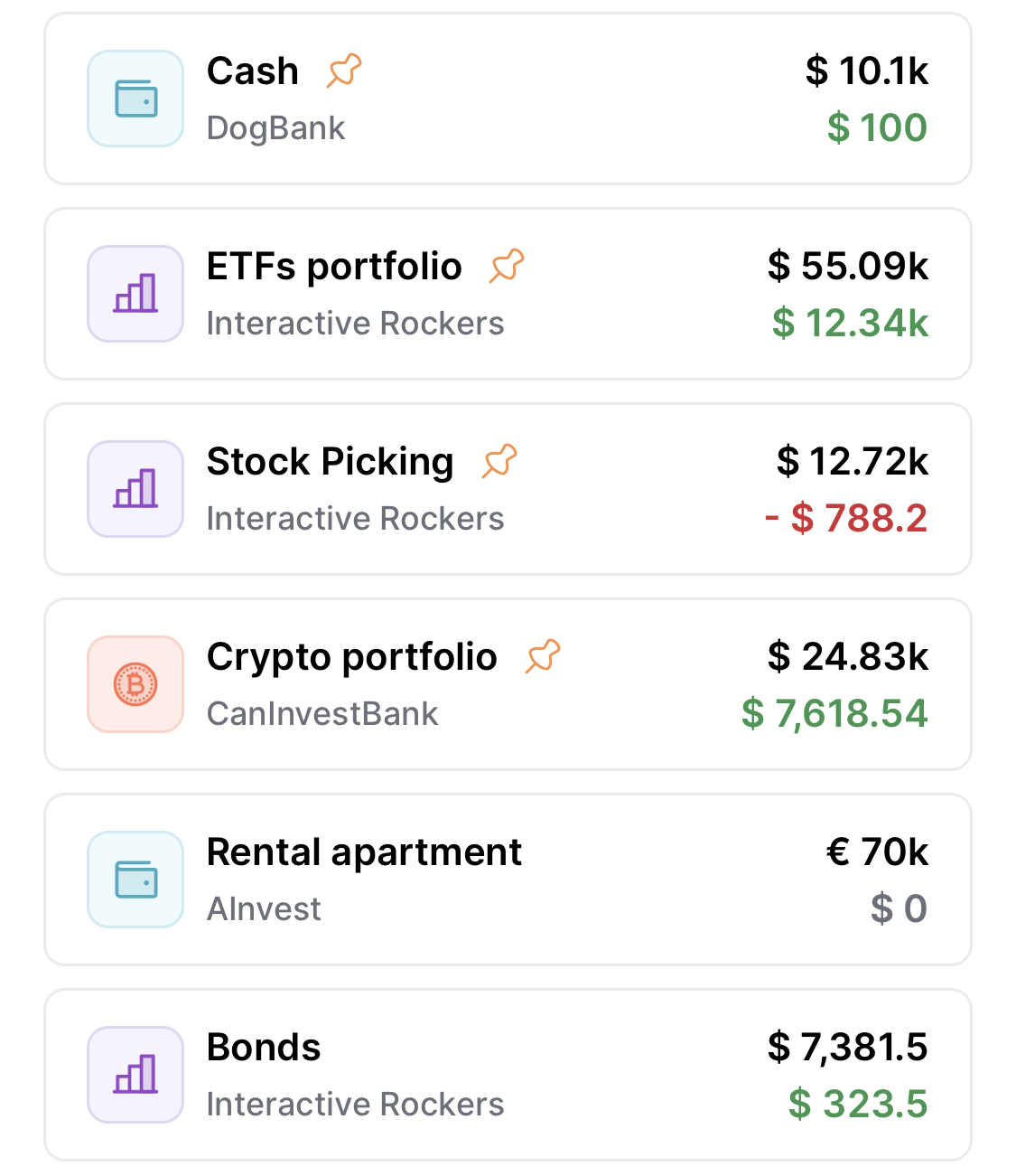 Track stocks, ETFs, crypto, real estate, and more